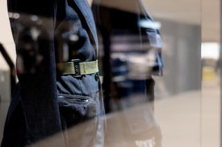 黒いジャケットに緑の帯を巻いたマネキンのような人影。ガラス越しに見るその姿は、現実と虚構の狭間に立つ。