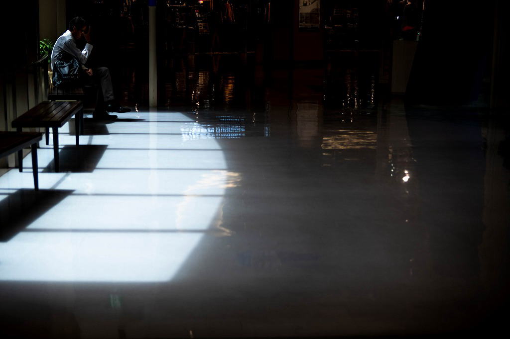 誰も気づかない。誰も問わない。光だけが、彼の肩にそっと触れている。床に映る光の帯は、まるで彼の内面を映し出す鏡のようだ。