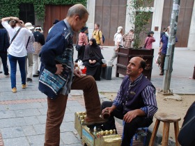 街角で靴磨きのはしゃれた靴磨きが旦那どちらからと会話が聞こえるようです。