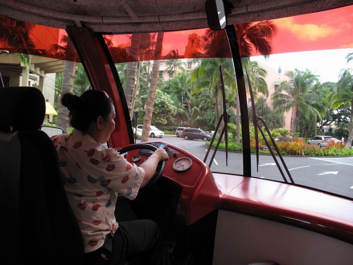 観光バスの女性ドライバーはアロハを着ていました
