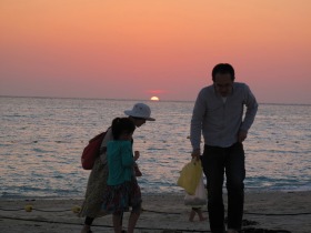 夕日をバックに家族で貝殻を探していました