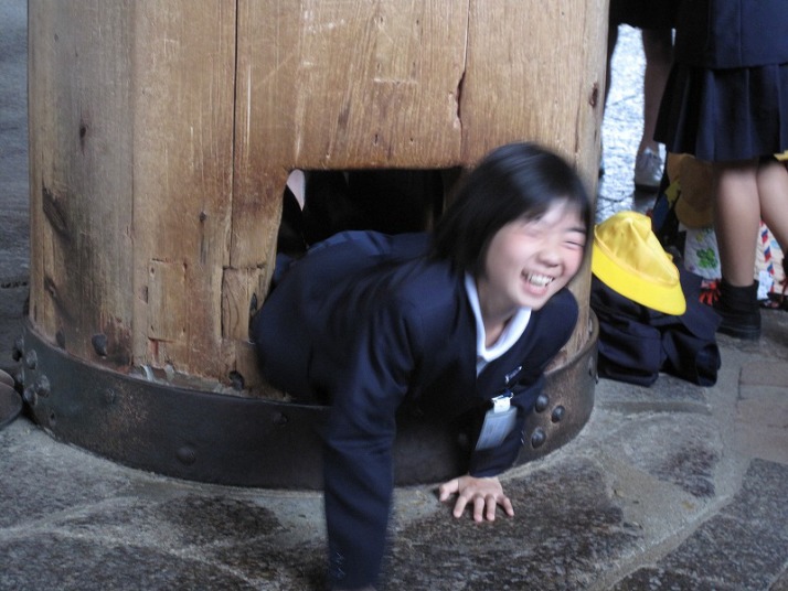 修学旅行生が通り抜けに挑戦なかなか抜けなくて苦労していました