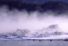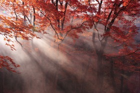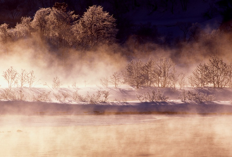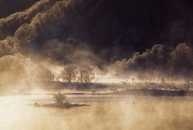 霧ではモノトーンの世界。その霧に朝日が射せば黄金色の世界が広がる。