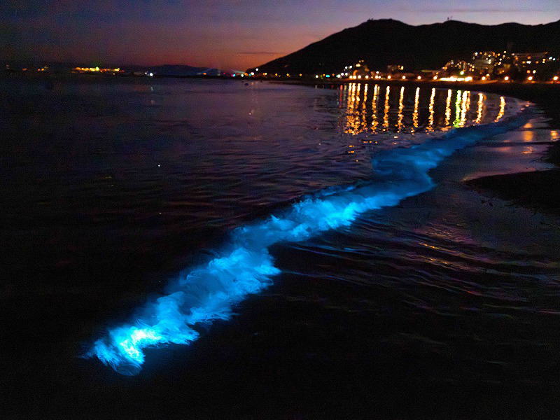 神秘的な海岸の景色。空の色や街明かりも効果的です。(フジフイルムGFX50sⅡ 35ミリ 絞りf5・6 30分の1秒)