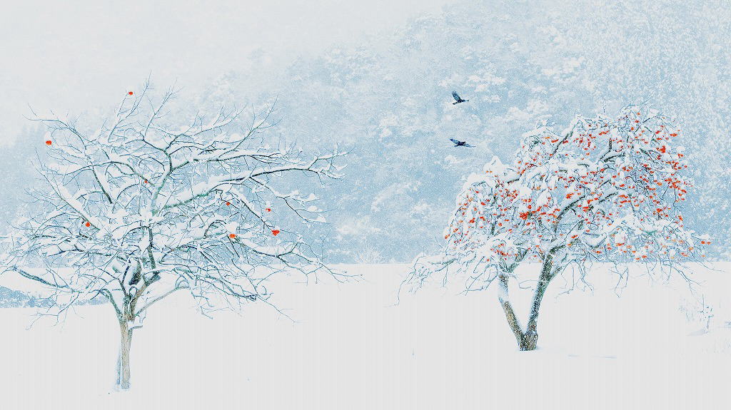 選評 :柿の木が雪に耐え、その存在を示しているかのように2本並んでいます。